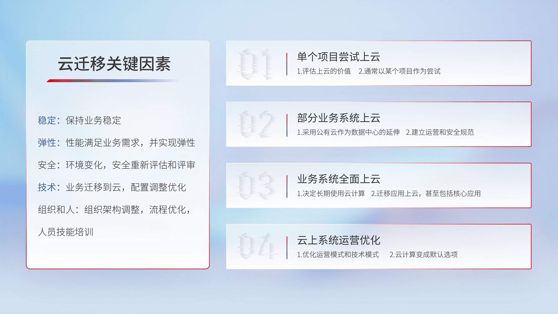 结合实际业务,,,,从规划设计、、、云平台选型、、云原生改造、、、、数据迁移、、、、集成交付,,迁移全过程为客户识别最佳上云路径,,,做好风险识别管理,,,设计网络架构、、身份权限、、、安全审计合规、、、、操作审计、、日志审计、、、、监控告警策略、、多站点容灾设计等,,,对云上基础设施进行整体规划,,提升IT治理水平,,,以满足弹性、、、、高可用、、高性能的需求。。。。