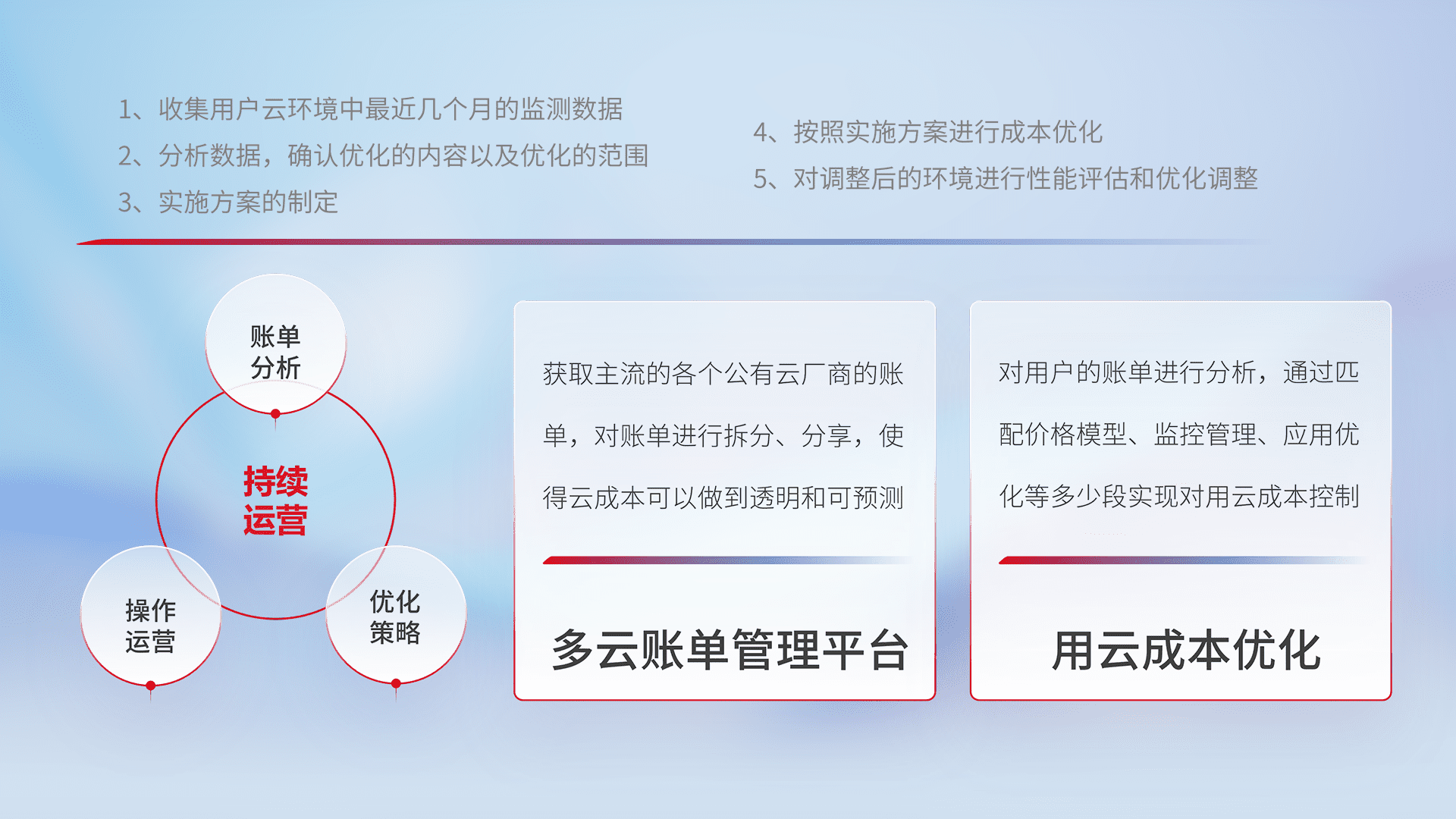 通过多云纳管,,,,以统一的资源数据模型把客户的云资源进行抽象和封装,,,进而实现对多云资源的统一操作,,保障云资源管理的可靠性、、、、稳定性与可用性。。。量身定制化运维内容,,,,配置、、、开发运维、、、补丁管理、、、、备份、、监控、、、、认证和访问管理、、、、审计和日常巡检等,,,,保障在用云过程中的可靠度,,稳定度以及高可用率。。。。